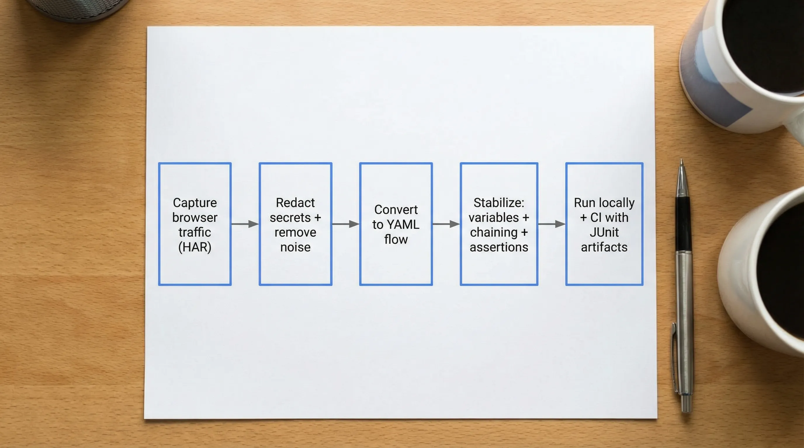 Should we commit HAR files to Git? Usually no. HAR files often contain secrets, cookies, and PII, and they include noisy browser traffic. Prefer committing sanitized, deterministic YAML flows and treating raw HAR captures as transient inputs.
